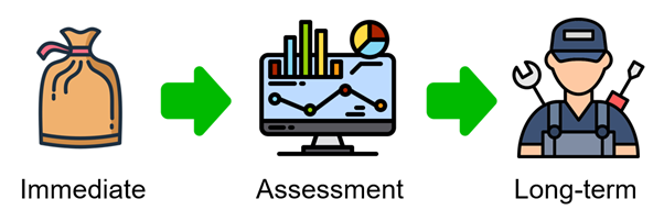 Starting with immediate ground stabilization and water management. Leak point needs to be sealed and reinforcement to stop movement of soil and water into the underground. This involves deploying a large volume of sandbag and concrete pouring to seal off the source of water flow and prevent more soil from the leak point, and locating the leak point to immediately stop water flow. Rainfall is also the concerned point making soil flow easily. Sandbags could be used temporarily to prevent rainwater from entering collapsed areas, which could further destabilize the soil. Related officers conducted all mentioned immediate mitigation to stop further damage.