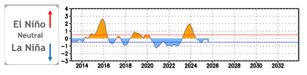 海洋ニーニョ指数(ONI)は現在、中立状態を示していますが、現在負の局面(ラニーニャ現象)に向かっている状況です。多くの国際機関の予測では、2026年2月にはラニーニャ傾向から中立状態に再び戻り、2026年4月まではその状態が続くものと予測されています。