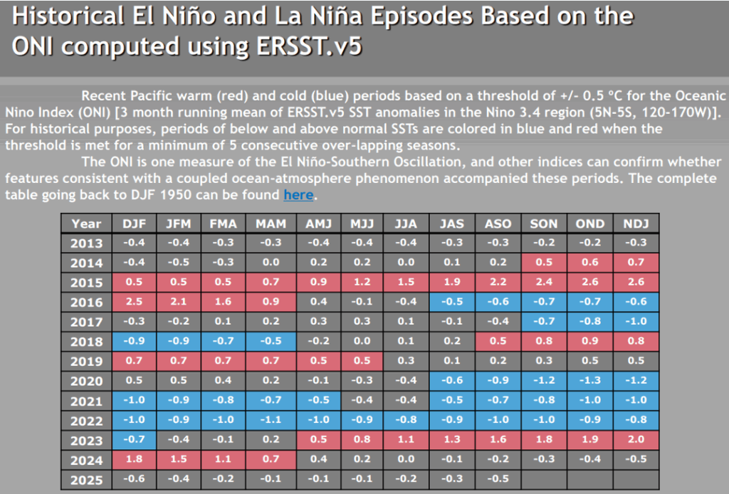 下図は、アメリカ海洋大気庁(NOAA)が公表しているエルニーニョ/ラニーニャの発現指標となるONI(海洋ニーニョ指数)の2013年以降の推移状況です。ONIが0.5以上となる期間が継続するとエルニーニョの発生を、-0.5以下となる期間が継続するとラニーニャの発生をそれぞれ示します。