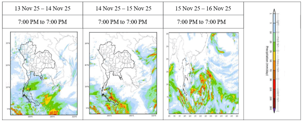 2025年11月12日時点の累積降雨量は昨年同時期と比較すると全国的に上回っており、特に北部・中部地域、バンコク近郊など、チャオプラヤ水系流域では全体的に大きく増加しています。平年値との比較では、タイ南部や北東部・中部地域の一部を除く多くの地域が平年値を顕著に上回っており、南部地域などでは平年値を下回っている状況です。