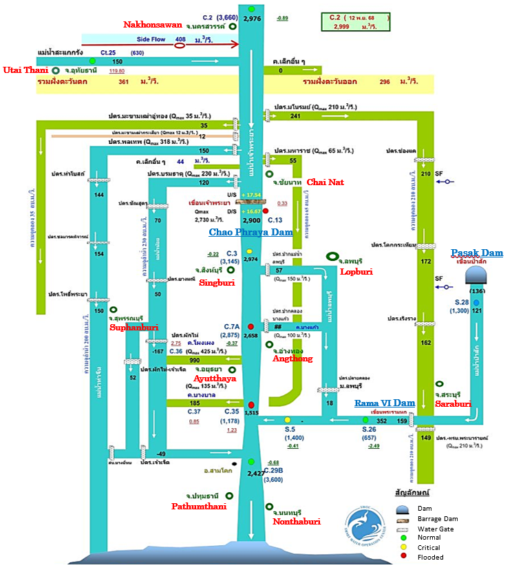 チャオプラヤ川上流域では、降雨量の増加によるダム放流量の増加により、依然として洪水が発生しています。最も懸念されるのはピン川です。プミポンダムが最大容量に達し、放流量が増加し、チャオプラヤ川下流域の水位上昇に引続き影響を及ぼすものとみられています。