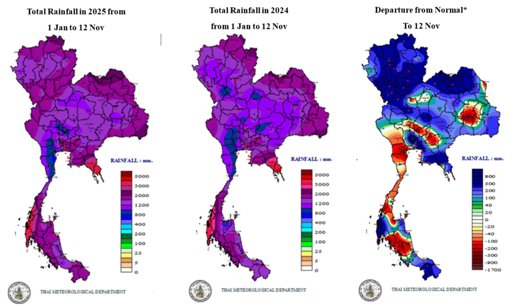 下図は左からそれぞれ、2025年1月1日~11月12日における累積降雨量、2024年1月1日~11月12日における累積降雨量、および2025年1月1日~11月12日における累積降雨量と平年値(*過去30 年間の平均値)の差についてのタイ国内の分布を示しています。