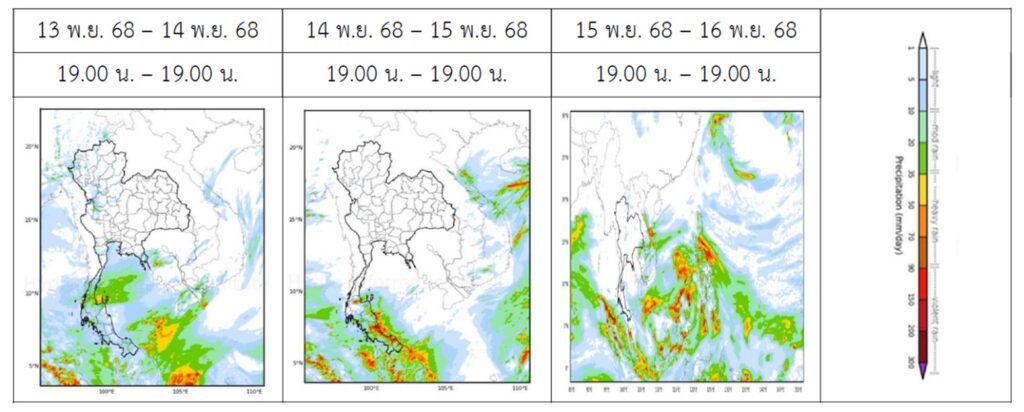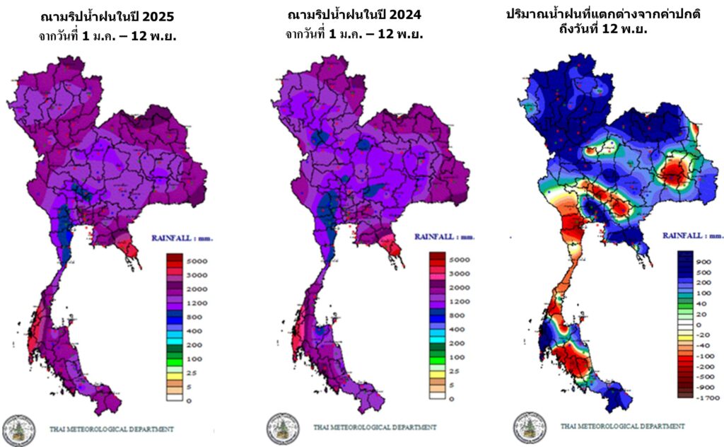 อ้างอิงแผนภาพด้านล่างจากซ้ายไปขวาคือ ปริมาณน้ำฝนสะสมในช่วง 1 ม.ค. – 12 พ.ย. 2025, 1 ม.ค. – 12 พ.ย. 2024 และปริมาณน้ำฝนที่แตกต่างจากค่าปกติ (ปริมาณน้ำฝนเฉลี่ยภายในระยะเวลา 30 ปี)