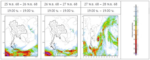 นอกจากนี้ การพยากรณ์อากาศ 3 วันซึ่งเผยแพร่เมื่อวันที่ 25 พฤศจิกายน โดยศูนย์ปฏิบัติการน้ำอัจฉริยะ (SWOC) ซึ่งเป็นหน่วยงานภายใต้กรมชลประทาน (RID) ได้คาดการณ์ว่าจะมีฝนตกหนักในภาคใต้ของประเทศไทยและคาบสมุทรมลายูเนื่องจากความกดอากาศต่ำกำลังแรงและลมมรสุมตะวันออกเฉียงเหนือ จึงได้มีการแนะนำให้ระมัดระวังอันตรายจากฝนตกหนัก น้ำท่วมฉับพลัน และน้ำท่วมในพื้นที่ลุ่มต่ำ