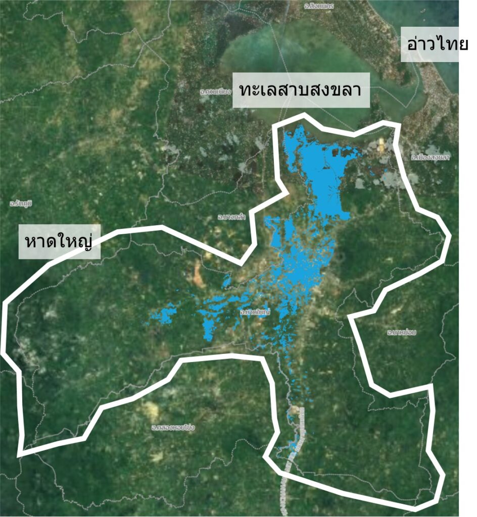 - จากการวิเคราะห์ข้อมูลการสังเกตการณ์ดาวเทียมระหว่างวันที่ 19-25 พฤศจิกายน 2025 ระบุว่าพื้นที่ประมาณ 146,297 ไร่ (ประมาณ 234 ตารางกิโลเมตร) ในจังหวัดสงขลาอาจได้รับผลกระทบจากน้ำท่วมในครั้งนี้