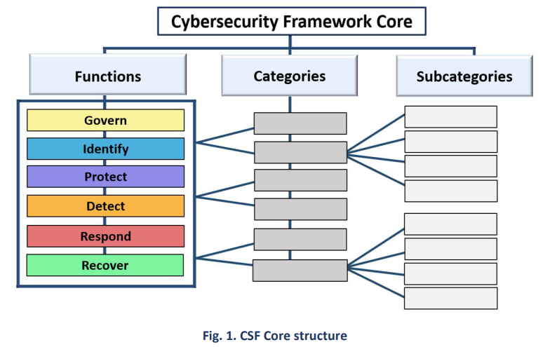 โดยทั่วไปแล้วหน่วยงานรัฐ เอกชน หรือองค์กรต่าง ๆ มักนิยมใช้ Framework ของ NIST Cyber Security Framework 2.0 เพื่อเป็นแนวทางในการจัดการความเสี่ยงไซเบอร์ (Cyber risks) เนื่องจากตัวเฟรมเวิร์คสามารถปรับใช้ได้กับทุกอุตสาหกรรมและองค์กรทุกขนาด โดยมีวัตถุประสงค์เพื่อช่วยให้องค์กรสามารถ ประเมินความเสี่ยง, วางแผน, และพัฒนาศักยภาพด้าน Cybersecurity ซึ่งเป็นปัจจัยสำคัญต่อความต่อเนื่องทางธุรกิจ เราสามารถสรุปองค์ประกอบของ Cybersecurity ตาม framework ของ NIST ได้ดังนี้